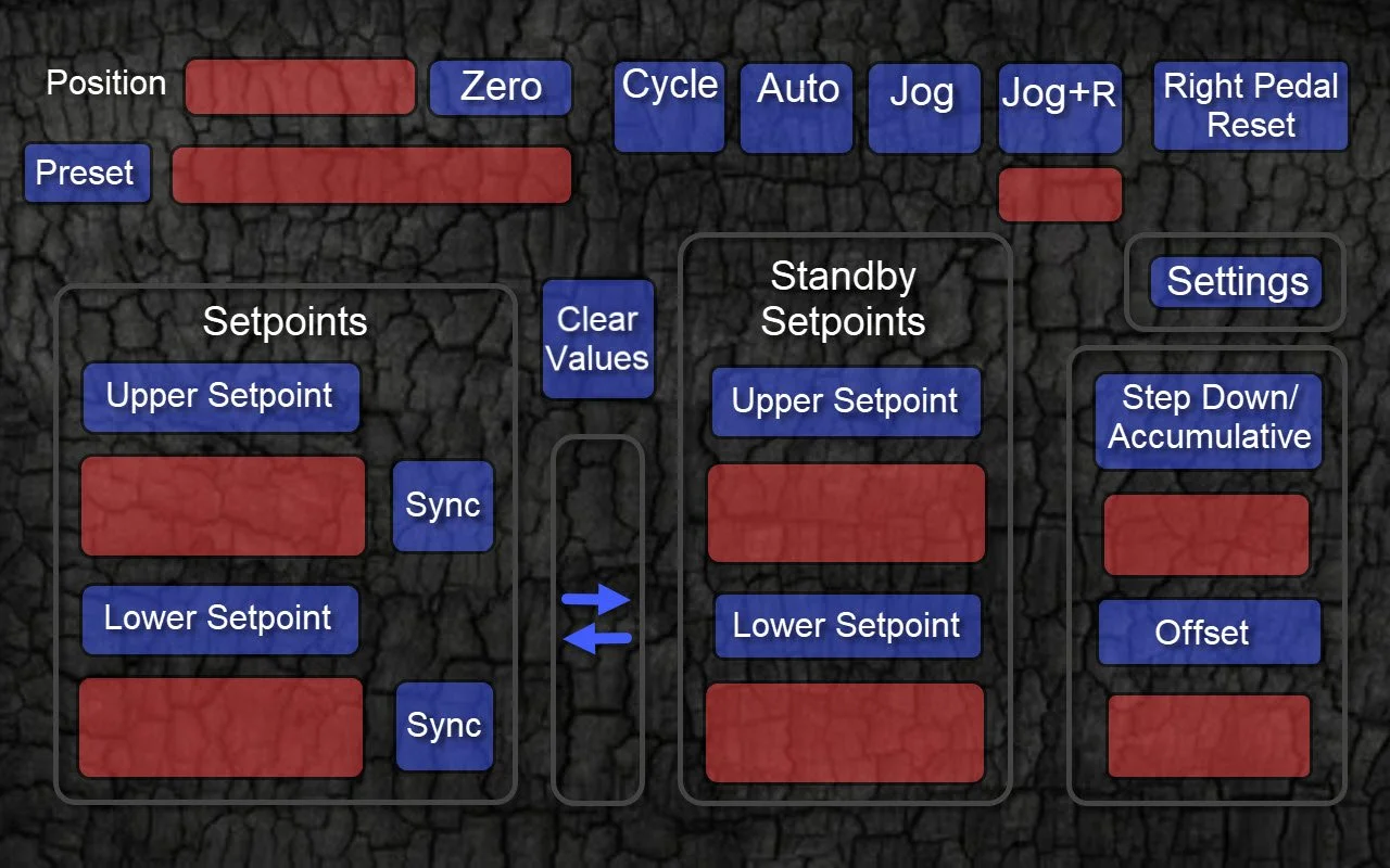 • Zero: sets the current position to 0.00 so all setpoints are measured from that reference.