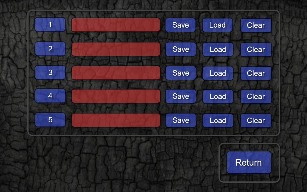 • Save 1–5: saves your current setup into that slot. Load 1–5: recalls a saved setup instantly. Tap the number to name a preset. Up to five full configurations are available.