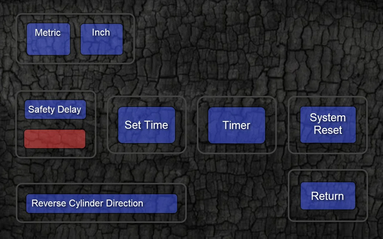 • Units (Inch/MM): switches displayed and input units; the system also switches pressure units (PSI/BAR) to match.