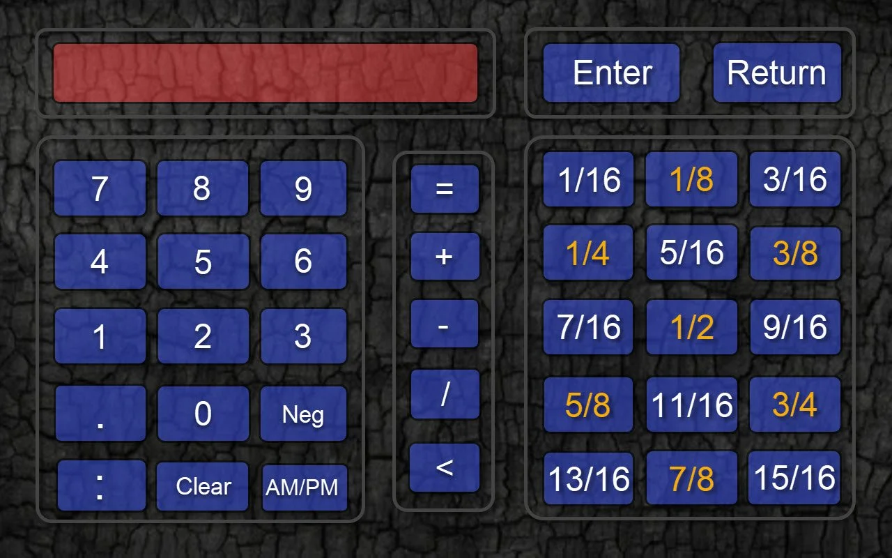 Enter values as whole numbers, decimals, or fractions. The keypad includes a built-in calculator for quick calculations.